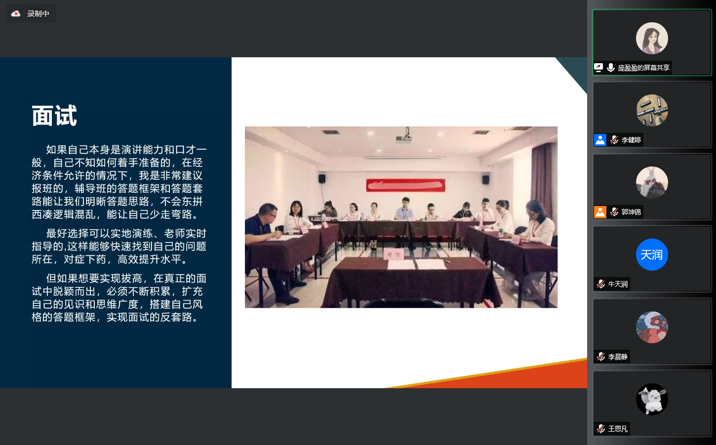 首先是庞莹莹学姐的交流分享。庞莹莹学姐就如何进行基础学习、归纳总结、如何选择岗位和提升面试水平等进行了分享。告知在考公路途中迷茫学子们正确的学习道路,并给予美好的祝福:披星戴月走过的路,最终将会繁华满池。