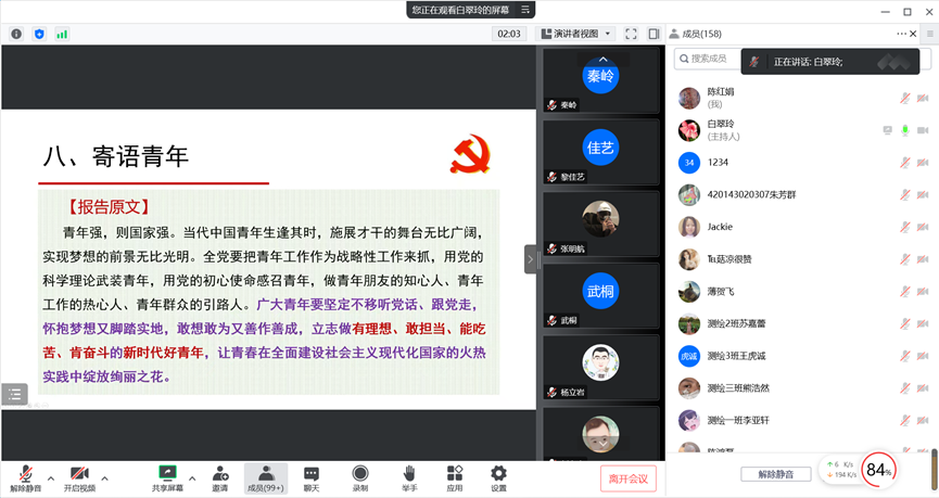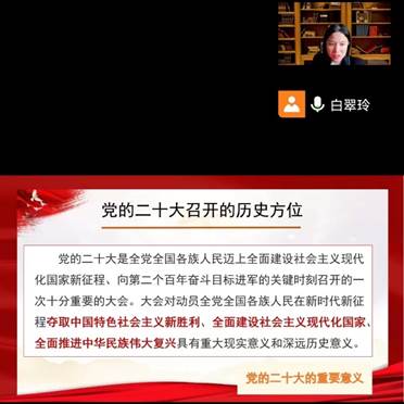 党委书记白翠玲通过腾讯会议为全院教师和学生党员宣讲党的二十大精神。