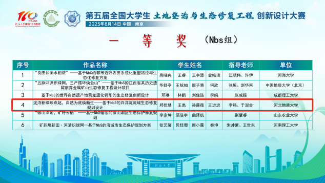 全国大学生土地整治与生态修复工程创新设计大赛旨在全面落实生态文明战略,优化国土空间开发保护格局,助力大学生运用理论知识解决资源环境领域土地整治与生态修复问题,共同为中国式现代化贡献智慧和力量。在本次大赛中,我院参赛学生和指导老师们在临时党小组的带动下,以黄大年团队“教书育人、敢为人先”的敬业精神为指引,努力推进项目进展,反复打磨和完善项目材料,最终在决赛中斩获佳绩。
