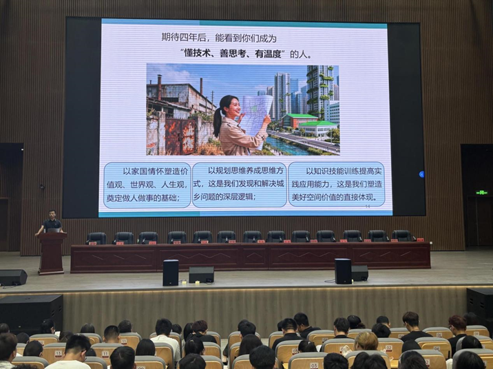 最后,孟佳与全体新生提出三个“约定”:一要求真,秉持严谨的态度,像测绘数据一样精准、像规划方案一样扎实,不浮躁、不敷衍,把“真学问”学到手。二要敢闯,积极参与科研项目、敢于在学科竞赛中挑战自己,把土地人的“开拓精神”融入青春里。三要有担当,走进偷情