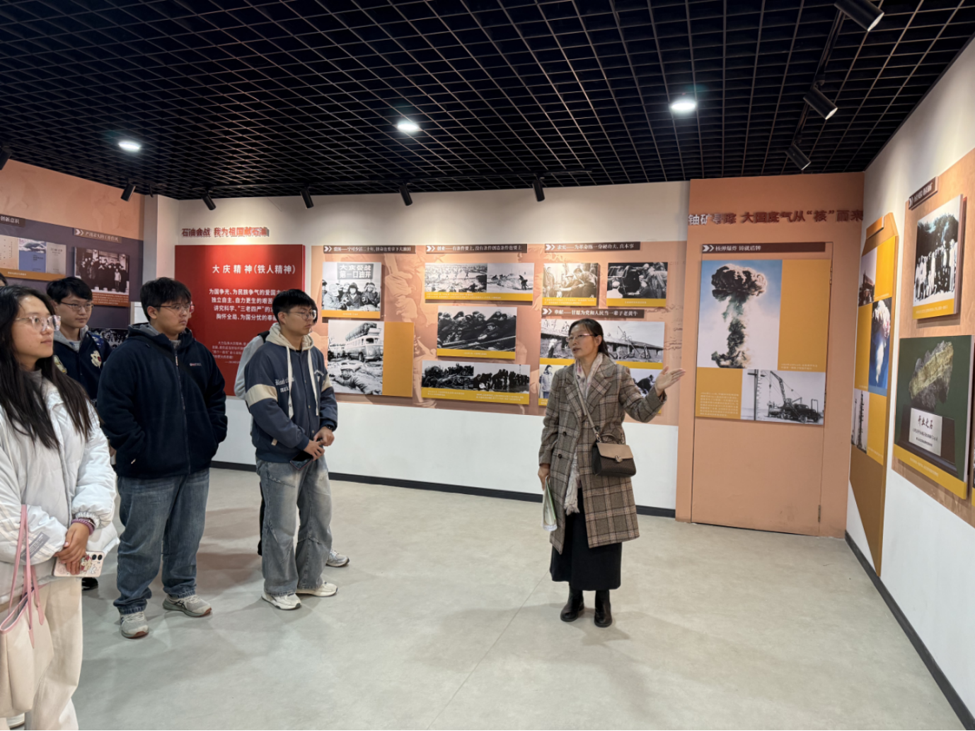 在思政馆内,师生们依次参观了“寻路奠基·地质卫国”“探路先行·立国兴邦”及“开路奋进·地质富国”等主题展厅。讲解老师从中国古代地质知识的积累与实践为现代地质学奠定的独特文化根基讲起,随后聚焦我国矿产资源的开发历程,并深情回顾了以“大庆精神”为代表的先进人物与爱国事迹。