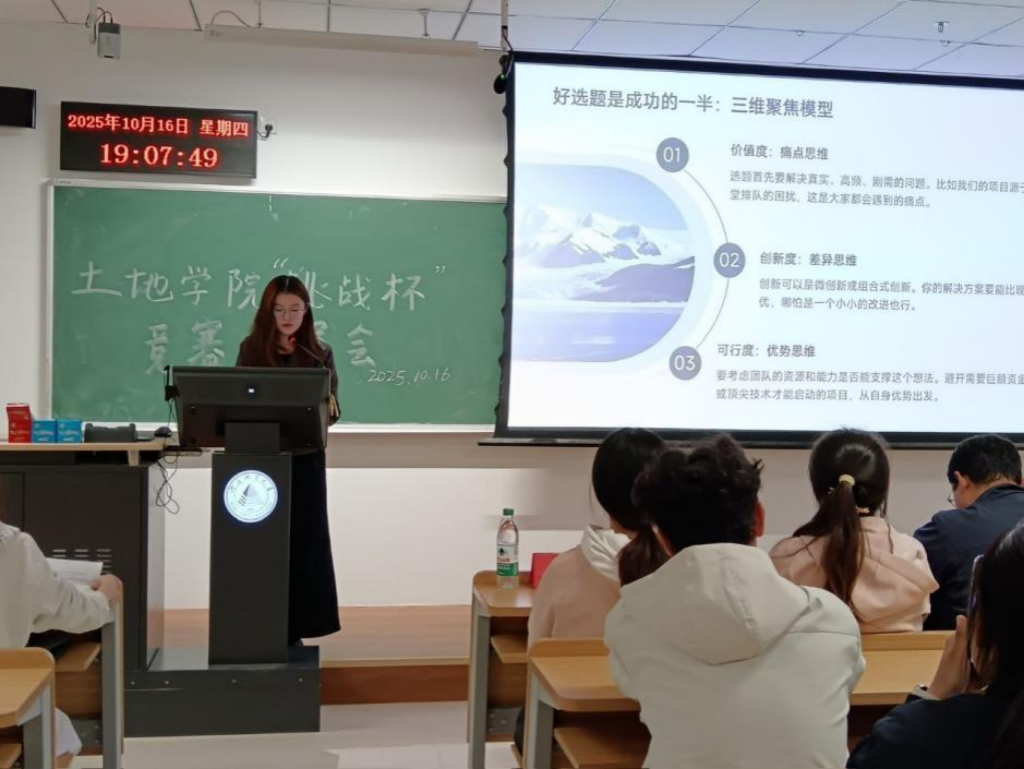 为进一步提升学生创新实践素养,激发参与科创赛事的的热情,充分调动学生投身创新创业竞赛积极性,2025年10月16日,由土地科学与规划学院科创中心组织的“挑战杯”大学生创业计划竞赛动员会在教一208顺利开展。