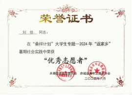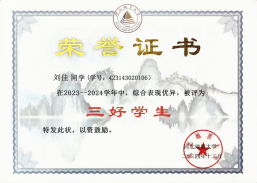 在专业学习上,刘佳同学勤勉笃学、锐意创新,始终保持严谨求实的治学态度。在校期间,曾荣获国家励志奖学金、山水励志奖学金、校级一等奖学金等多项荣誉,并获评“校级三好学生”,以扎实的专业功底和优异的综合表现,展现了新时代青年学子的求学热忱。