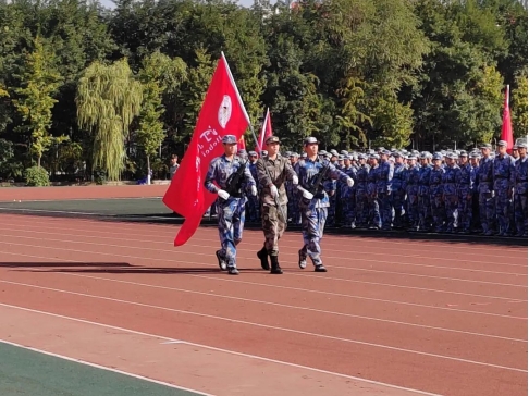 本部操场上举行了新生军训汇演。在激昂的进行曲中,国旗护卫方阵整齐划一、气宇轩昂!庄严的升旗仪式后,2023级新生军训会操表演正式开始。