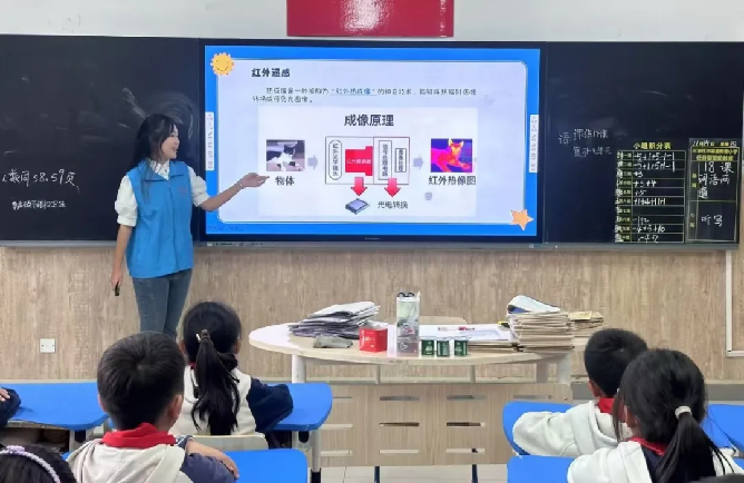 讲解员李美莹和孩子们分享遥感的特点和应用,她说:“红外遥感就像是一个超级英雄,它能看到物体的温度,即使在黑夜里也能看得清清楚楚。”她还继续用生动的例子吸引孩子们的注意力让孩子们感受到科技的神奇。她用简单易懂的语言和富有想象力的描述,让复杂的红外遥感技术变得亲切而有趣。