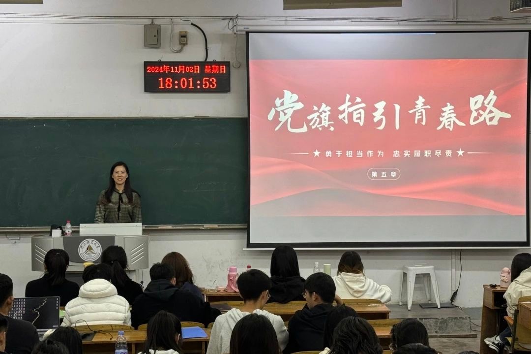 党委副书记孟佳老师为同学们讲授了一堂深刻的党课。在课上,孟书记引导同学们重新审视自己与一名正式共产党员之间的联系与差距,并勉励大家时刻以党员的标准来严格要求自己。同时,孟书记着重指出,我们在加强自我管理的同时,也应不断提升自身的思想政治水平。