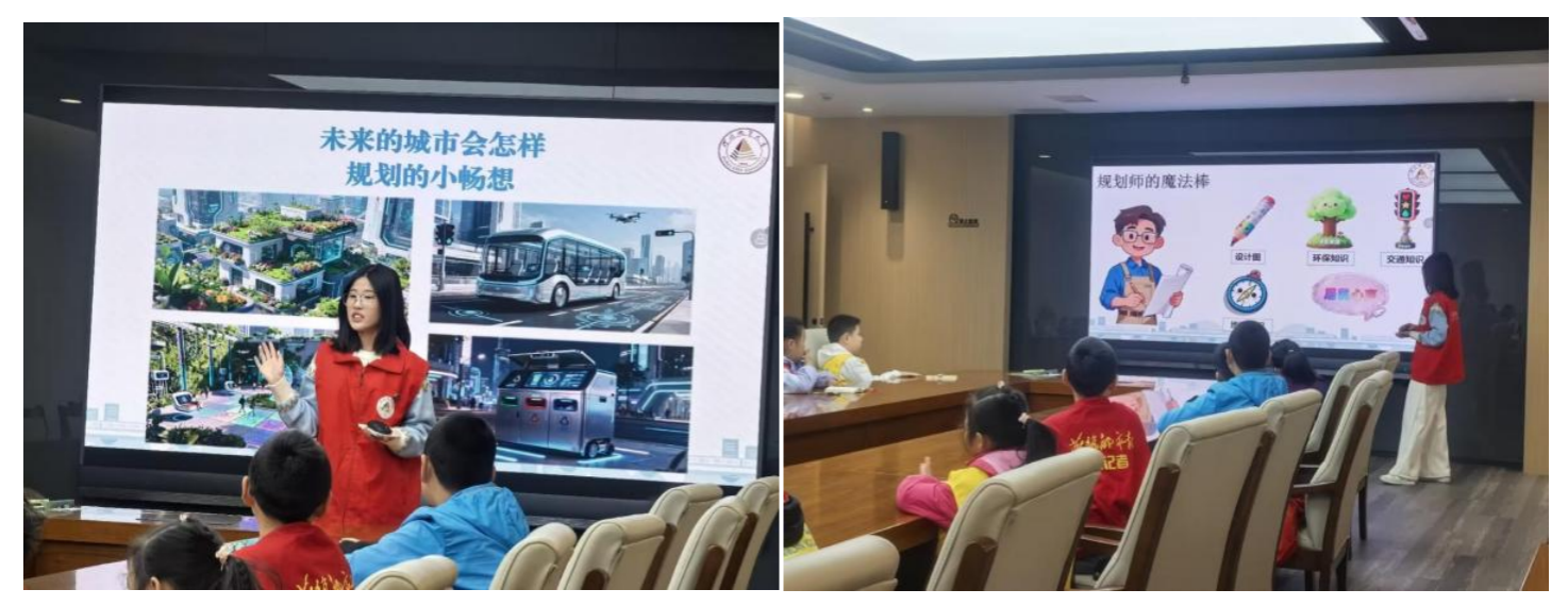 活动中,刘思思同学首先向孩子们介绍了城乡规划的基本概念。她将其核心解释为 “通过合理安排城市与乡村的空间布局,让我们的生活更加方便和美好” 。为了让抽象的概念变得具体可感,刘思思还分享了“规划师一天的工作”流程。她从带着问题外出拍照调研,再到最终动手绘制规划图,一步步拆解,引领小朋友们在自己的脑海中,初步构建起一个项目的规划过程。这一环节有效激发了孩子们对于规划专业的好奇与想象。