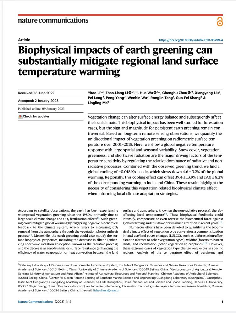 遥感创新科技团队尚国琲教授最近与中国科学院地理科学与资源研究所资源与环境信息系统国家重点实验室、中国科学院大学、中国农业科学院农业农村部农业遥感重点实验室、广东省科学院广州地理研究所、中国科学院空天信息创新研究院等6家单位合作完成的论文《Biophysical impacts of earth greening can substantially mitigate regional land surface temperature warming》(植被变绿生物物理反馈对全球地表温度的影响评估)最近在国际著名期刊《Nature Communications》上发表,标志着偷情