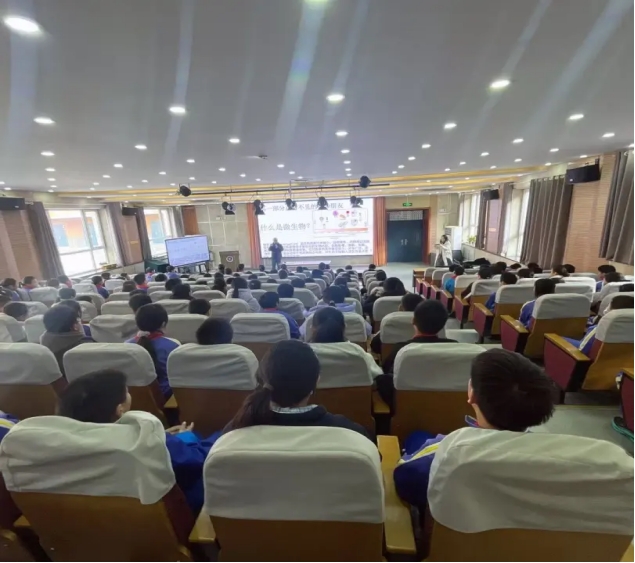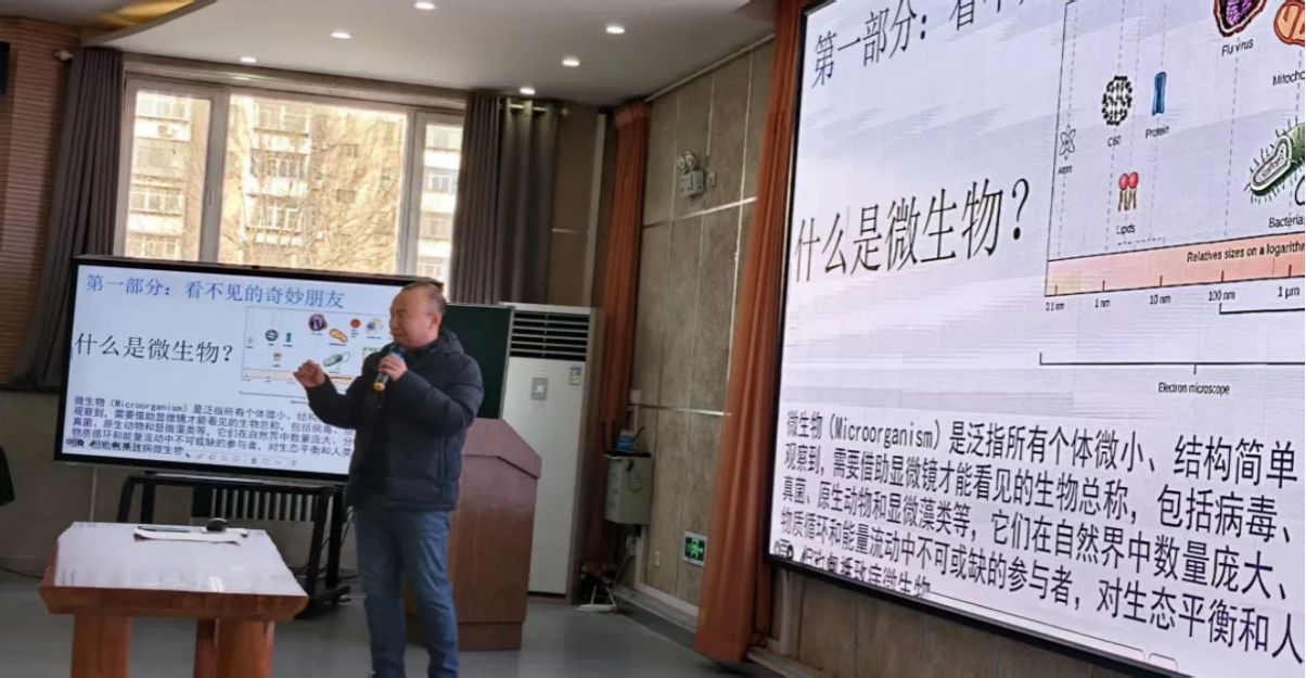 互动环节中,刘博士分享了微生物在生活中的应用,讲解其与农作物生长的关联,让同学们直观认识微生物的 “超能力”。